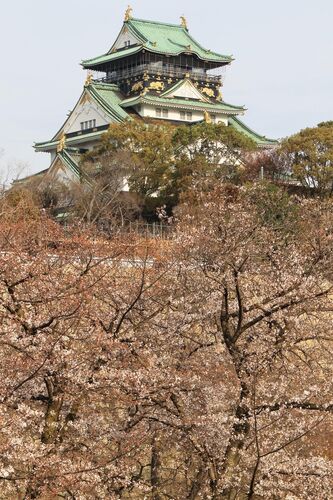 けさ、大阪城公園で見た天守閣と桜 けさは普段より1時間ほど早く家を出て、大阪城公園に向かった。 空一面を雲が覆っていて、日差しは期待できなかった。 それでも大阪城の桜を撮らないと、桜の季節を締めくくれないと思った。 天守閣を見上げるいつもの場所…